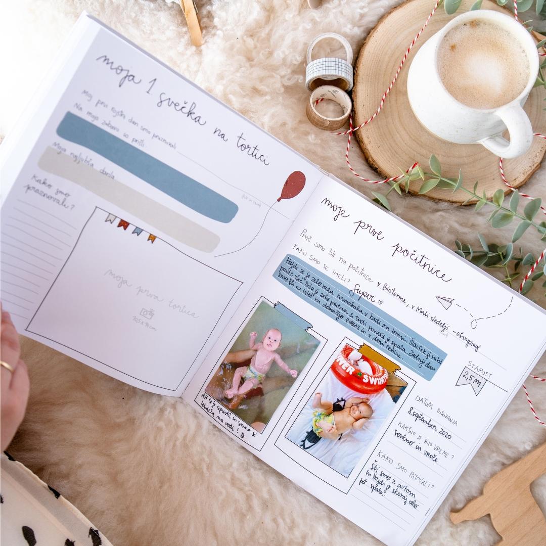 Dnevnik vsebuje podatke o rojstvu in vaših prvih skupnih trenutkih, o dnevu, ko je mala štručka prišla domov in predstavitev vaše družinice, kako izgleda dojenčkov dan – za vseh 12 mesecev. Prvi rojstni dan, prve počitnice, prvič naokoli, prvi božič in prostor za vse druge prve trenutke, ki so najpomembnejši vam, 8 strani za lepljenje najljubših fotografij ter 2 strani s črtami za lepe besede, namenjene vašemu otročku.